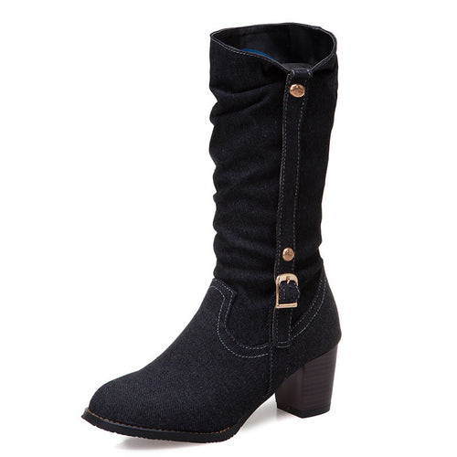 Die auffällige Gürtelschnalle ist ein modisches Detail. Erhältlich in den Farben Schwarz, Hellblau und Dunkelblau, passen diese Stiefel zu vielen Outfits.