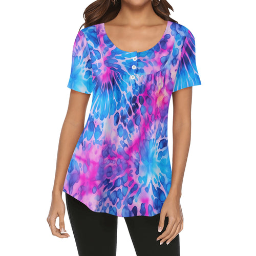 Lockere Bluse mit U-Ausschnitt und kurzen Ärmeln für Damen - Tie Dye v1