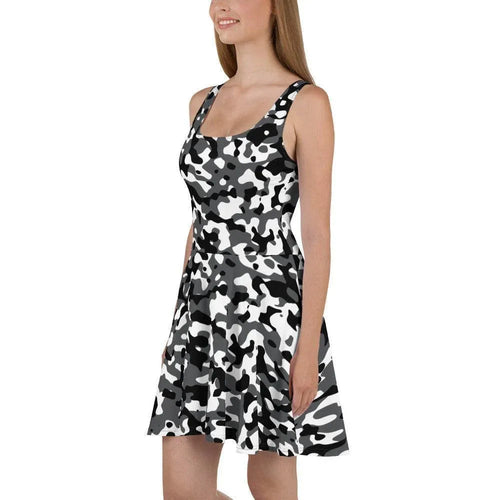 Verliebe dich in dein neues Lieblingskleid! Hol dir jetzt dein Schwarz Grau Weiß Camouflage Skater Kleid!