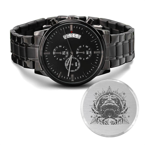 Entdecke unseren eleganten mit Sternzeichen Krebs gravierte Uhr aus hochwertigem Metall! Dieses Meisterwerk vereint Funktionalität und Eleganz in einem. Der Chronograph verfügt über ein präzises Quarzwerk mit dreifachen Zifferblatt.