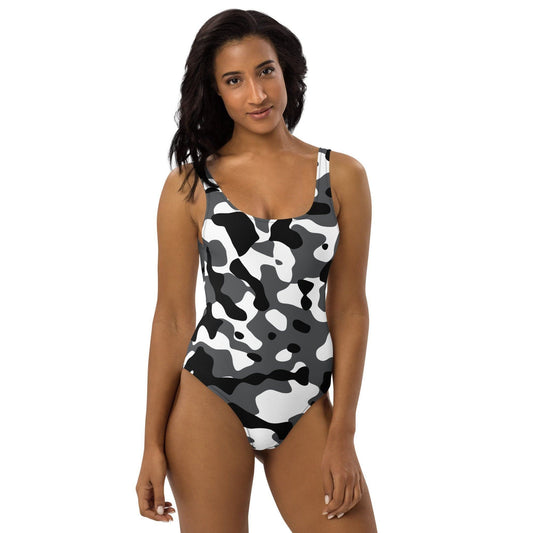 Unser Schwarz Grau Weiß Camouflage Badeanzug mit Cheeky Passform, U-Ausschnitt und U-Rückenausschnitt ist ein echter Hingucker. Die auffällige Camouflage-Optik verleiht dir einen trendigen und stylischen Look. Mit der Cheeky Passform betonst du deine Kurven und ziehst alle Blicke auf dich. Der U-Ausschnitt vorne und der U-Rückenausschnitt hinten geben dem Badeanzug...