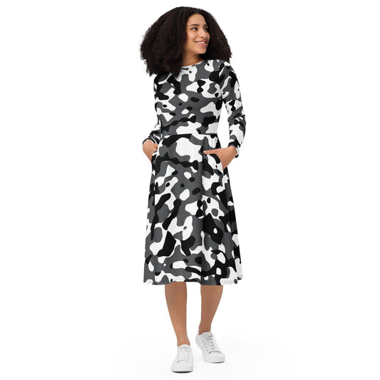 Das Schwarz Grau Weiß Camouflage Midikleid ist ein echter Hingucker. Gefertigt aus einem hochwertigen, mittelschweren Jersey-Strick, ist es elegant und bequem zugleich. Der klassische Boot-Ausschnitt schmeichelt dem Dekolleté und die eng anliegende Taille betont die weibliche Silhouette. Das trendige Camouflage-Muster verleiht dem Kleid eine coole Note und macht es zu...