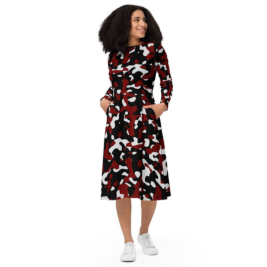 Das Schwarz Rot Weiß Camouflage Midikleid ist ein echter Hingucker. Gefertigt aus einem hochwertigen, mittelschweren Jersey-Strick, ist es elegant und bequem zugleich. Der klassische Boot-Ausschnitt schmeichelt dem Dekolleté und die eng anliegende Taille betont die weibliche Silhouette. Das trendige Camouflage-Muster verleiht dem Kleid eine coole Note und macht es zu...