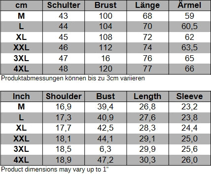 Er ist in den Größen M bis 4XL erhältlich, um eine optimale Passform zu gewährleisten.