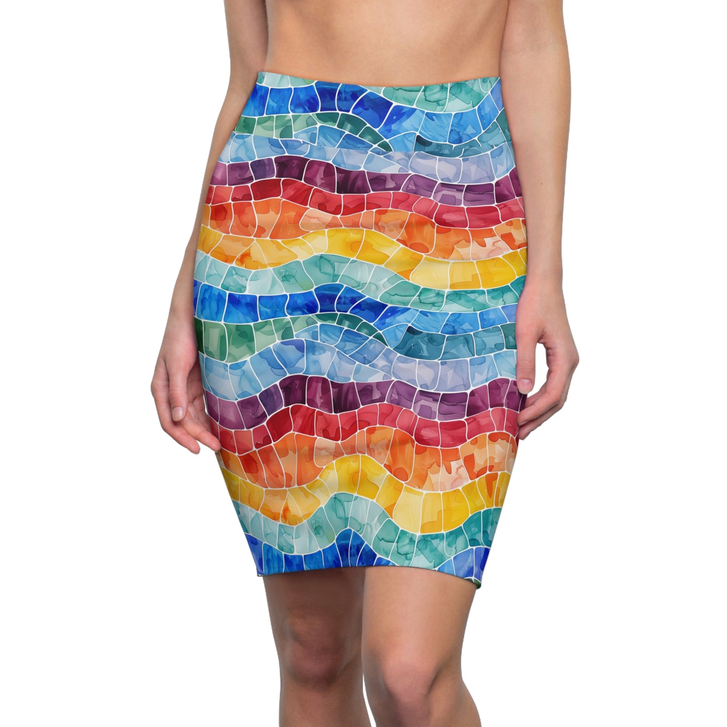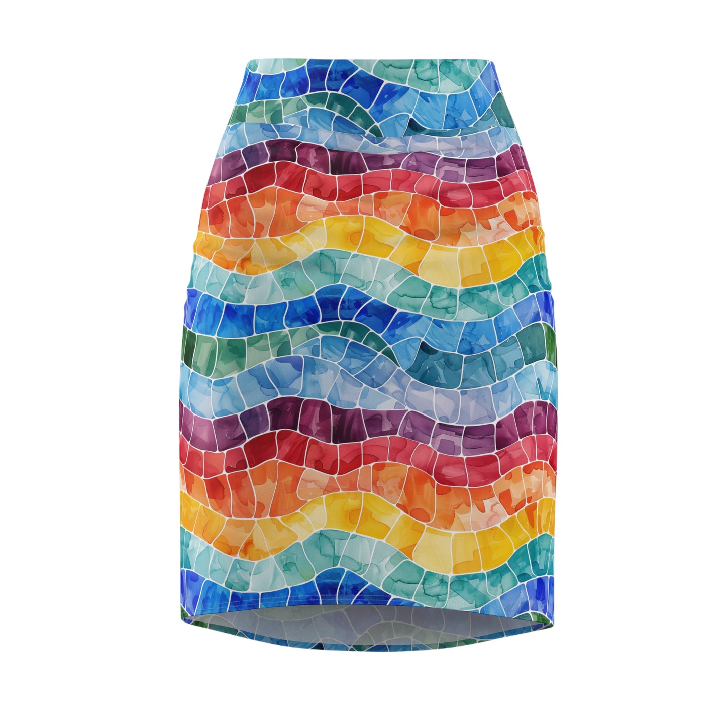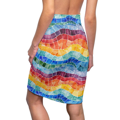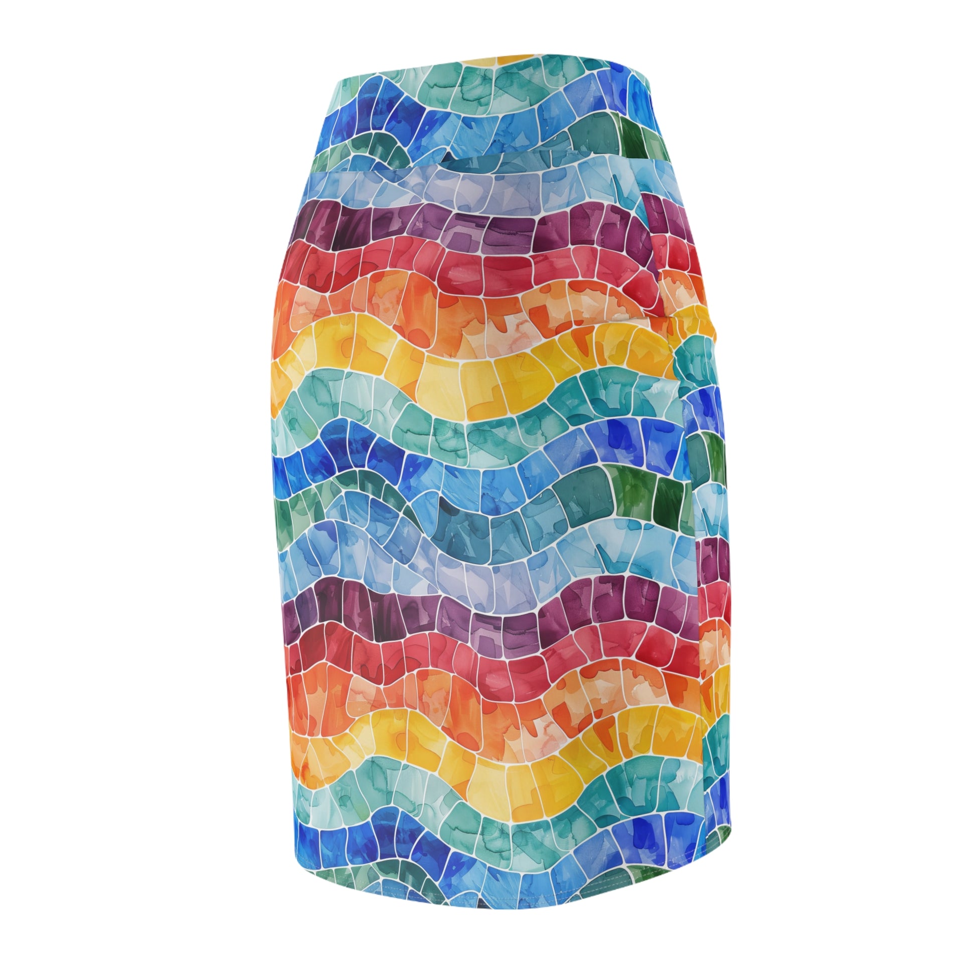 Wir präsentieren einen atemberaubenden Regenbogen Mosaik Bleistiftrock, perfekt für alle, die lebendigen Stil und hohen Tragekomfort schätzen.