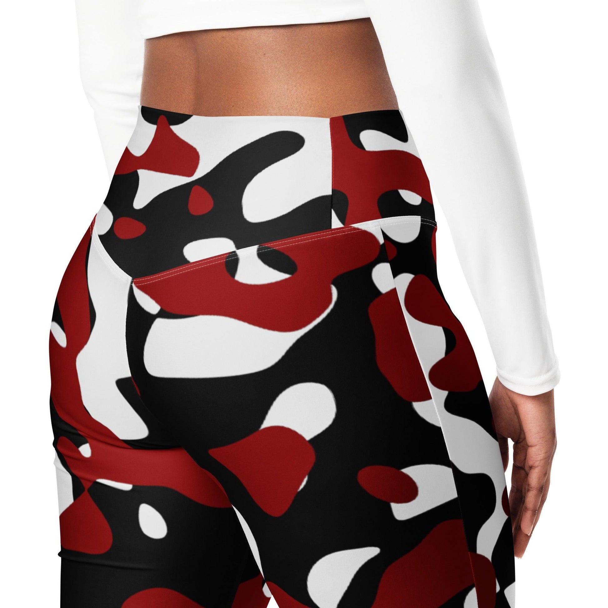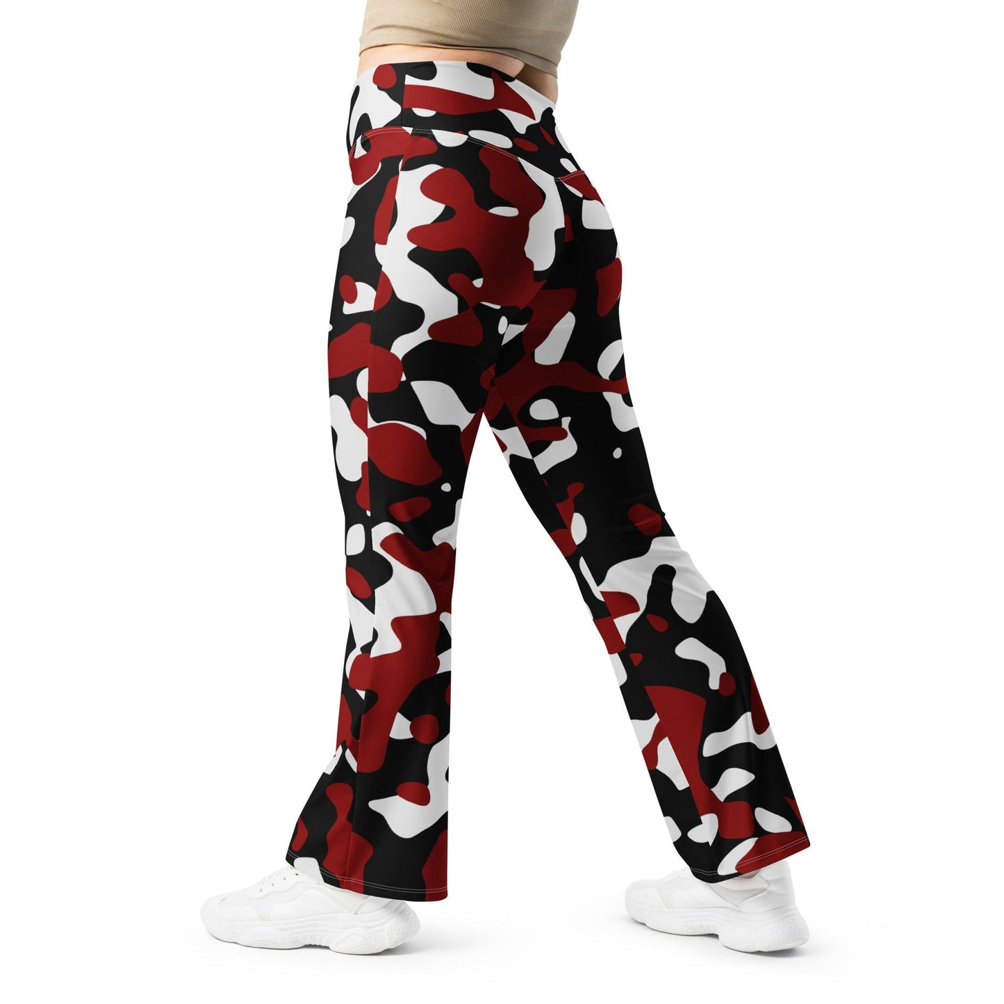 Investiere in Komfort und Stil: Bestelle jetzt deine Schwarz Rot Weiß Camouflage High Waist Flare Leggings und erlebe die perfekte Kombination aus Nachhaltigkeit, Funktion und Fashion!